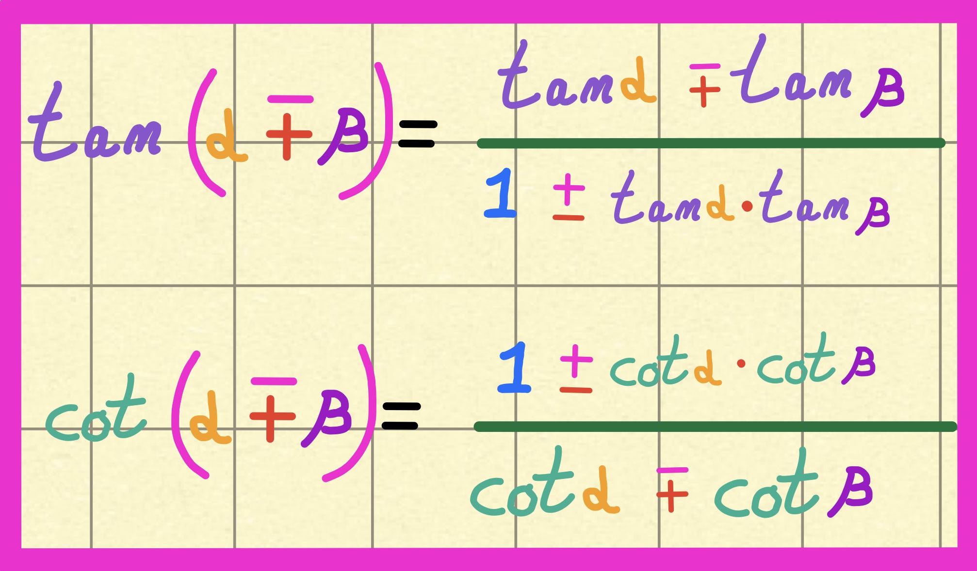 Utilizzando queste formule è possibile dimostrare facilmente le formule di addizione e sottrazione della tangente e della cotangente: