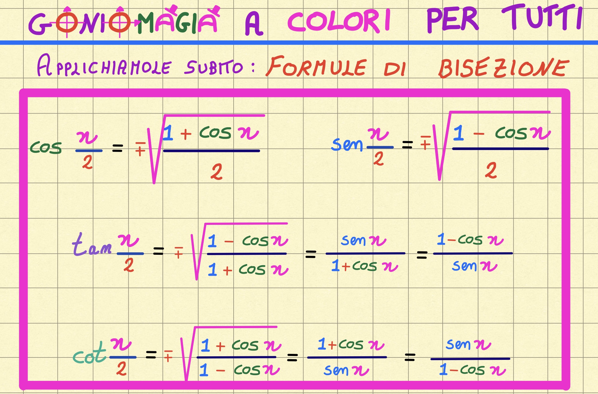 Dopo esserci dilettati con la filastrocca del SE CO CO SE CO CO CO SE… In questa lezione dimostreremo le formule di BISEZIONE utilizzando le formule di duplicazione del coseno
