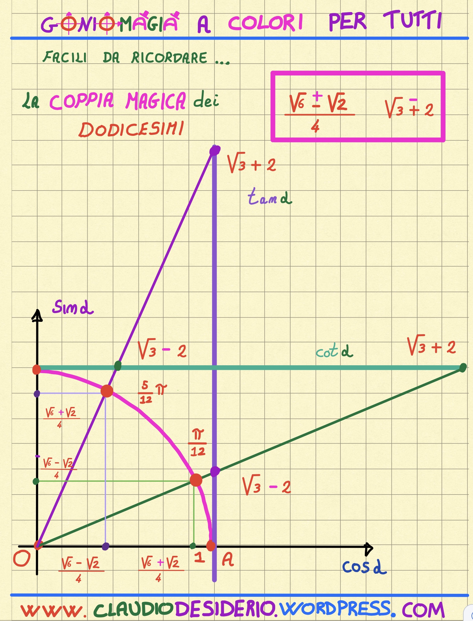 Sicuramente più difficili da memorizzare… utili per trovare i valori delle funzioni goniometriche relative agli angoli associati a 15° (e quindi a tutta la famiglia dei DODICESIMI, che abbiamo già incontrato nelle lezioni precedenti)…