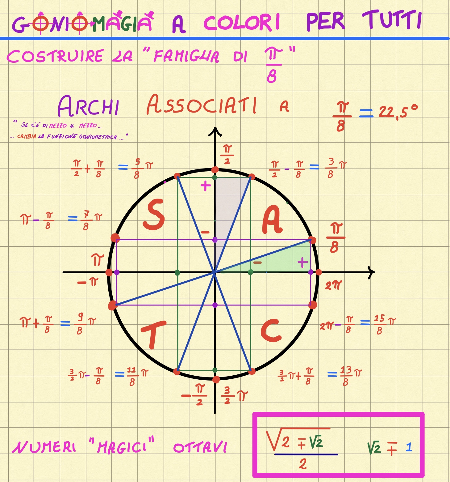 Ma soprattutto utili per trovare i valori delle funzioni goniometriche relativi all’angolo di 22°30 (la metà di 45°) e a creare una nuova famiglia di archi: la famiglia degli OTTAVI